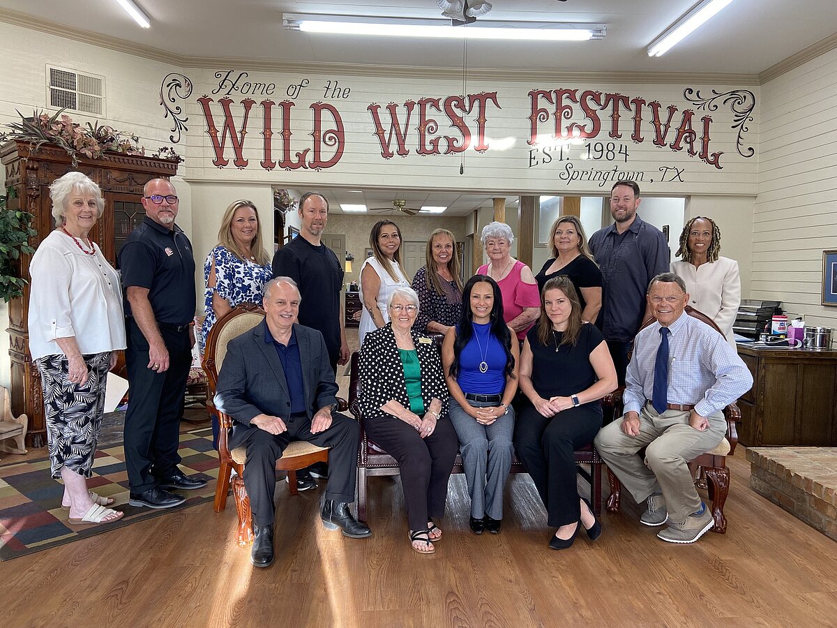 Pictured: Dene Berry, Administrative Assistant; Shane Strickland, Springtown ISD; Jennifer Polhemus, Individual; Robert Moss, Moss Rehabilitation Center, LLP; Jessica Castro, Springtown Septic & We Are Our Brothers Keepers; Kim Ware, Individual; Mary Jo Harms, Harms Livestock Farms; Judy Ray, Highland Furniture; Andrew Alvis, Legacy Church; Terri Toone, Director; David Miller, City Administrator City of Springtown; Tootie Hall, Individual; Paige Slate, Pinnacle Bank; Carolyn Rocha, Edward Jones; Larry Murphy, Individual